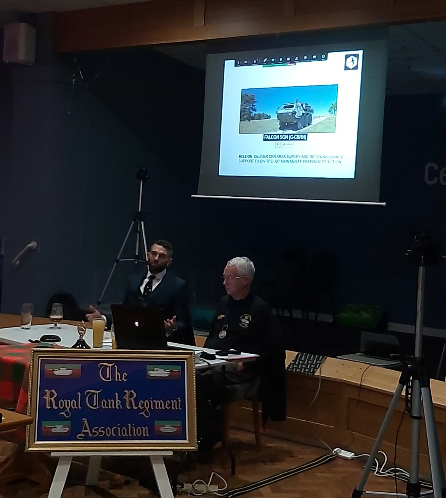 The meeting then closed, and the guest speaker was introduced, WOII Martin Morrin is the SSM of “Falcon” the RTR CBRN Squadron based at Harman Lines in Warminster and part of 28 Engineer Regiment. For the old and bold and CBRN? think NBC! Martin helped save the day for us by stepping in at the last minute when our planned speaker had to withdraw due to operational reasons. Martin told us that Falcon has an establishment of 84 people and although not always up to full strength is a well manned Squadron. He gave us an insight to the Fuchs, the six wheeled armoured vehicle which has been the main CBRN vehicle for over 20 years. We were informed that it has been upgraded and is far more capable than it was when it first entered service.